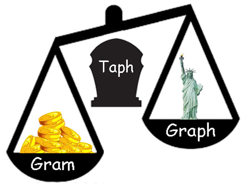 Recall that gram comes from gramma (letter of the alphabet). Gramma, in Greek, also means “a small weight,” and is a specific use of the word gramma, which classically means “a letter of the alphabet,” as I said above. Here is where the mnemonic device comes in.